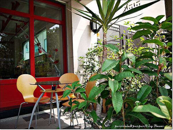 蓊鬱的翠綠植栽襯著豔紅的門框,印象鮮明,可惜招牌相形之下弱了些