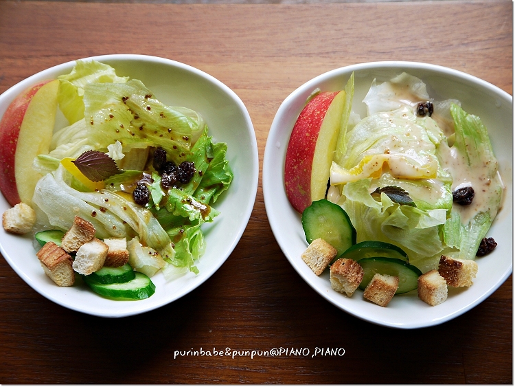 沙拉醬有千島、油醋、芝麻醬三種選擇,向來不愛千島,選擇再簡單不過