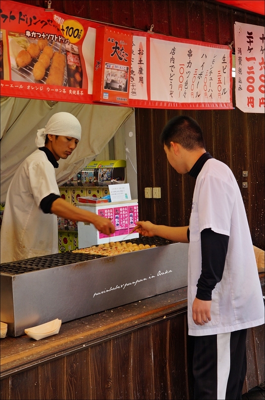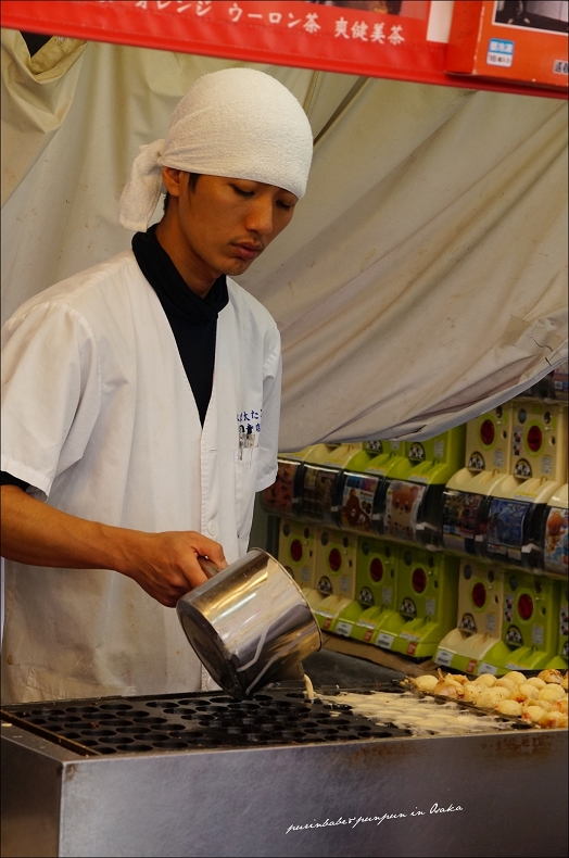 師傅不愧是大阪人,有著迷人酒嗓沙啞嗓音的平頭師傅負責點餐,綁頭巾師傅則努力翻滾吧章魚燒