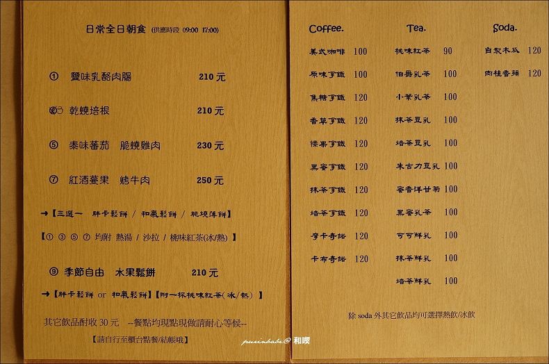早午餐皆附沙拉、濃湯、鬆餅、桃味冰茶,換購飲料需加價30元