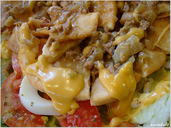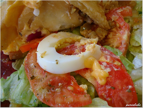底部鋪上滿滿的生菜、蕃茄片、水煮蛋及洋蔥司,表面淋上起司醬及特殊調味料